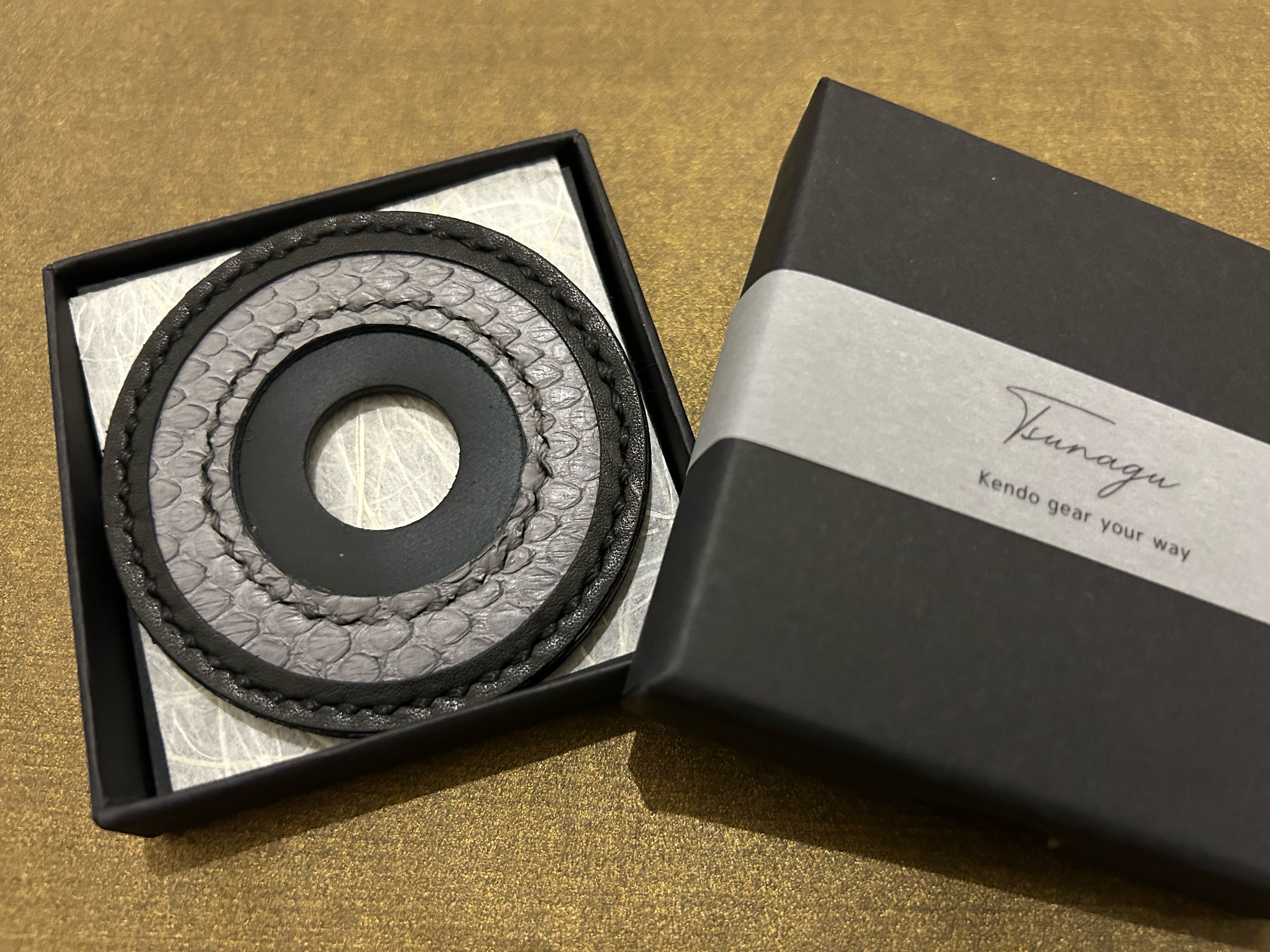 革職人が一点ずつ手刺しで仕立てた、錦蛇革の鍔止めです。