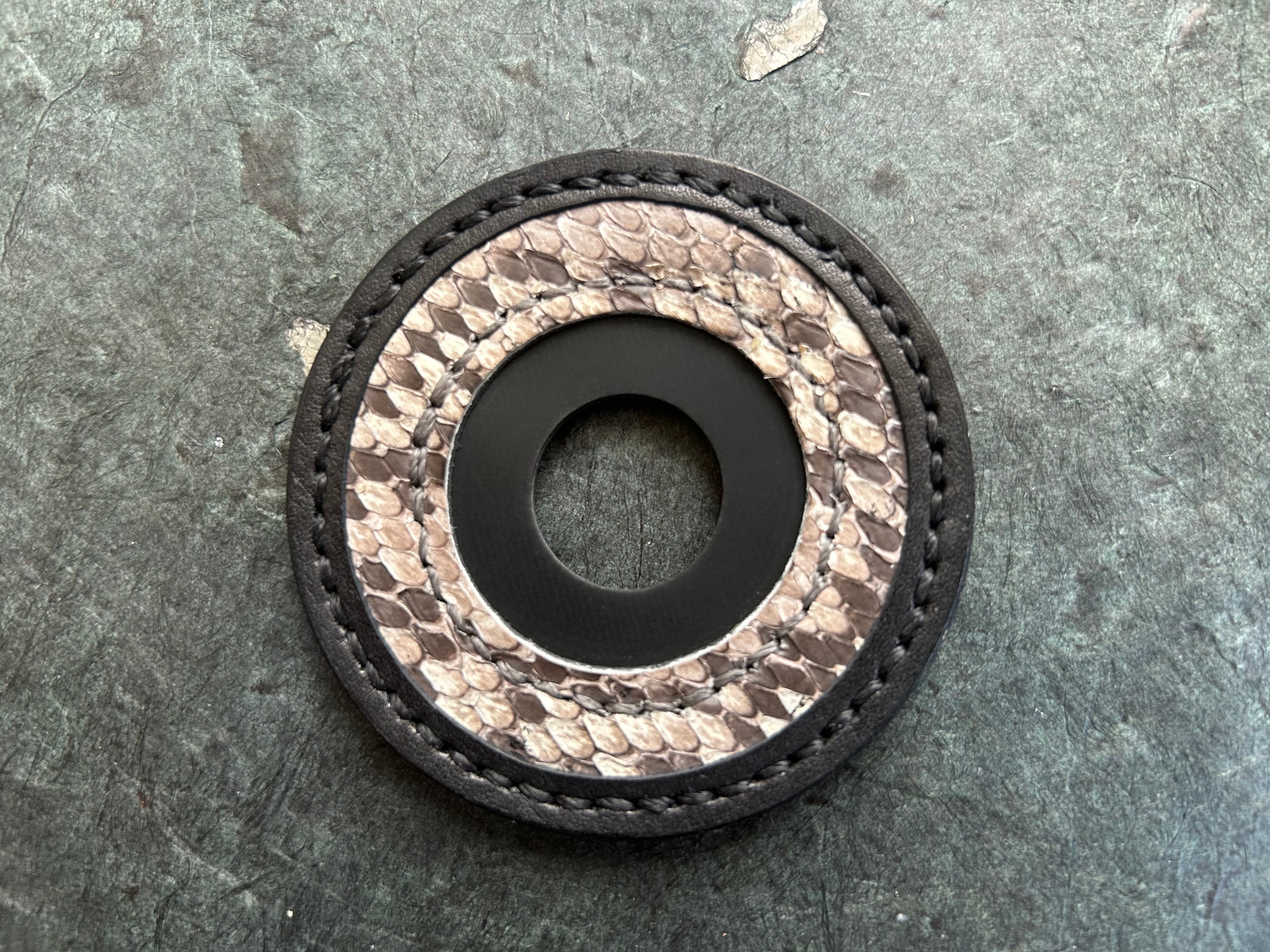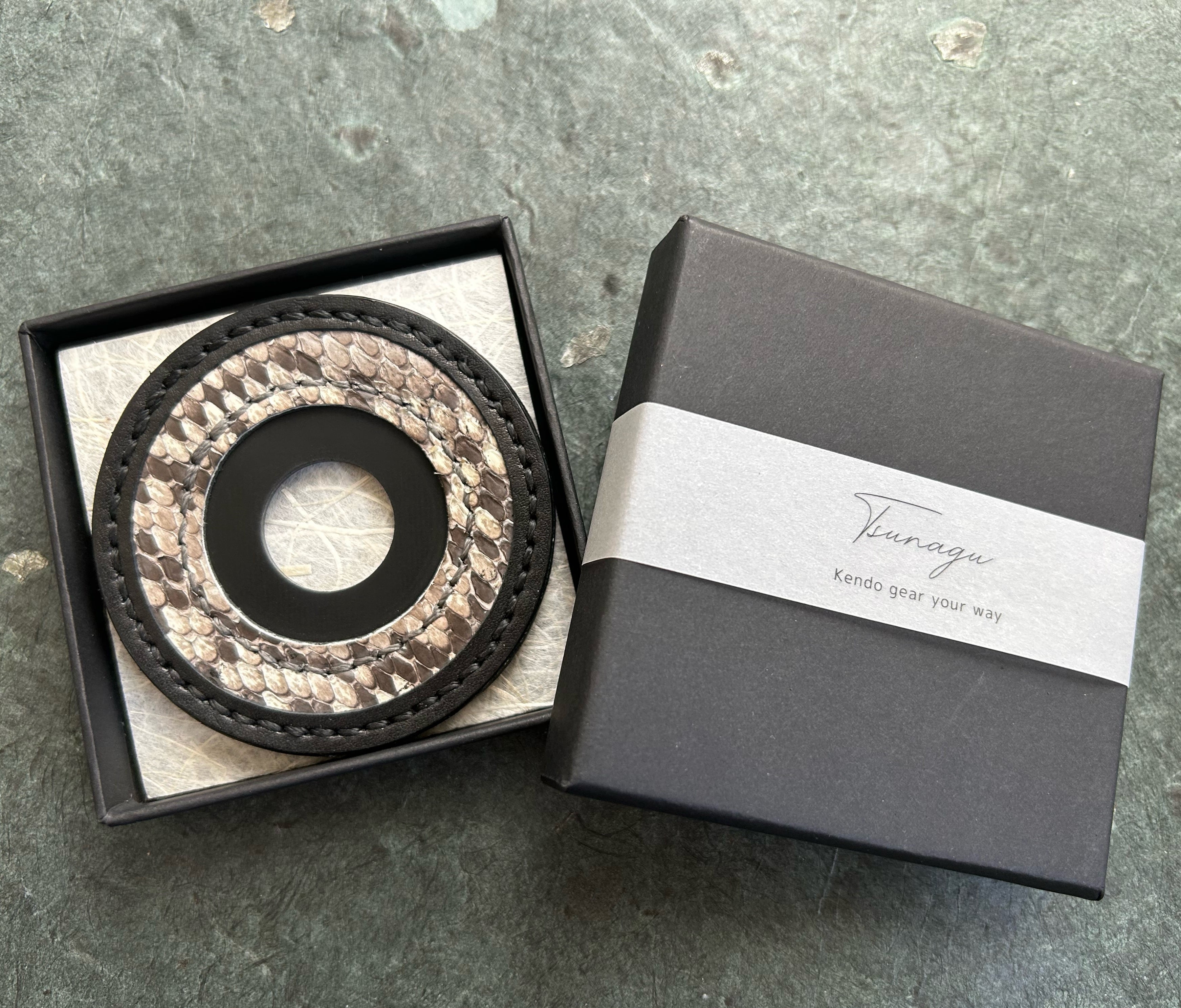 革職人が一点ずつ手縫いで仕立てた、錦蛇革の鍔止めです。