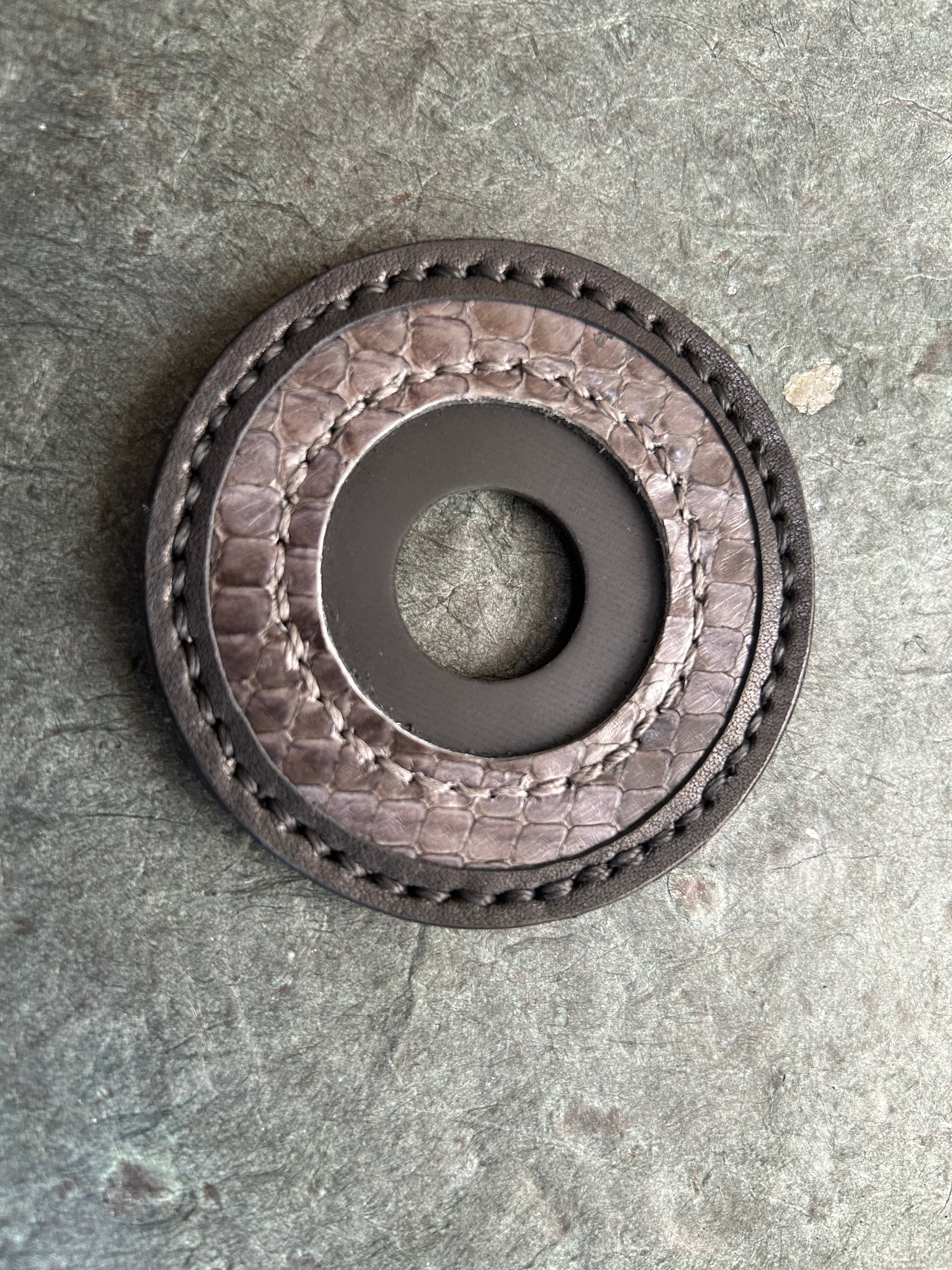 革職人が一点ずつ手縫いで仕立てた、錦蛇革の鍔止めです。